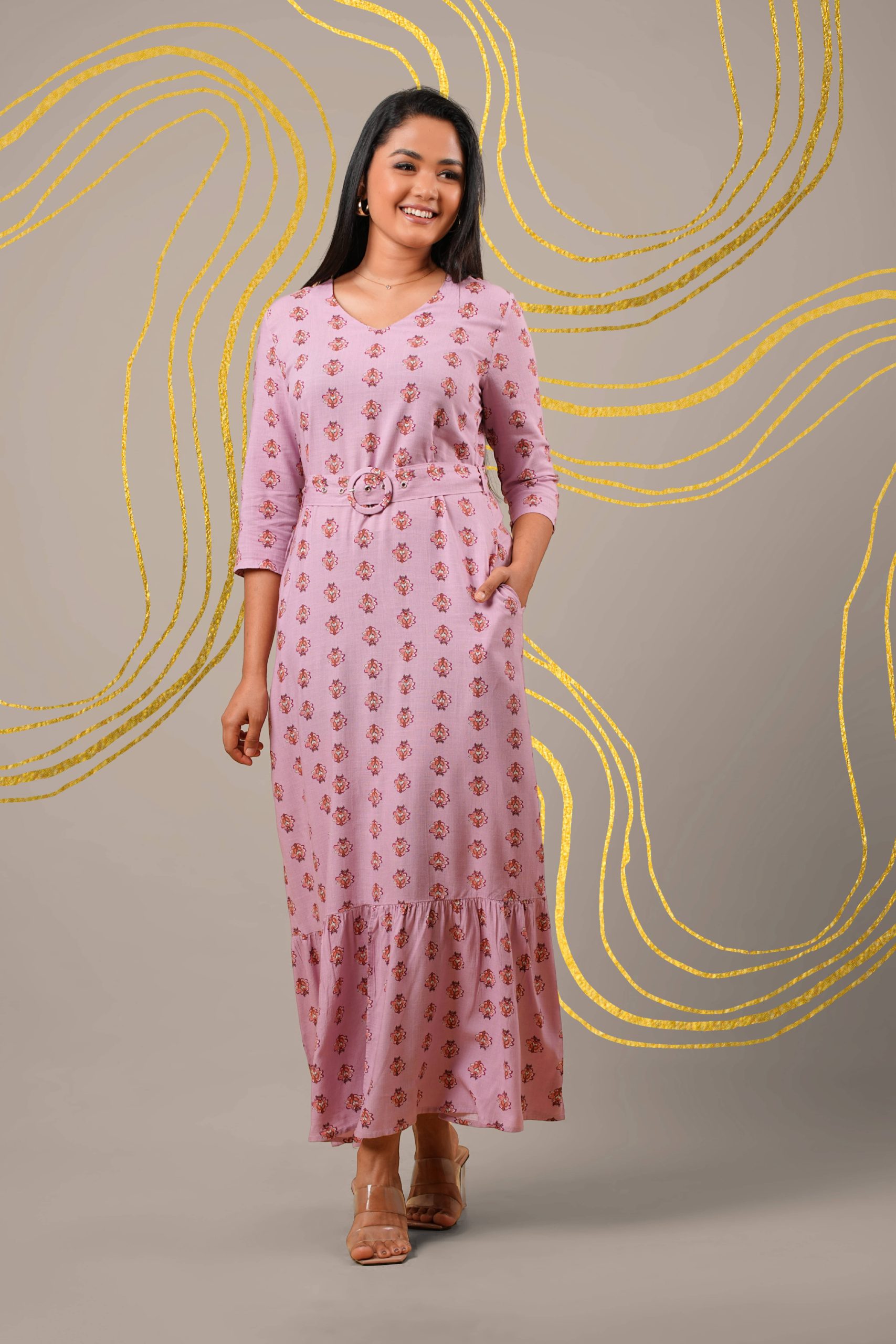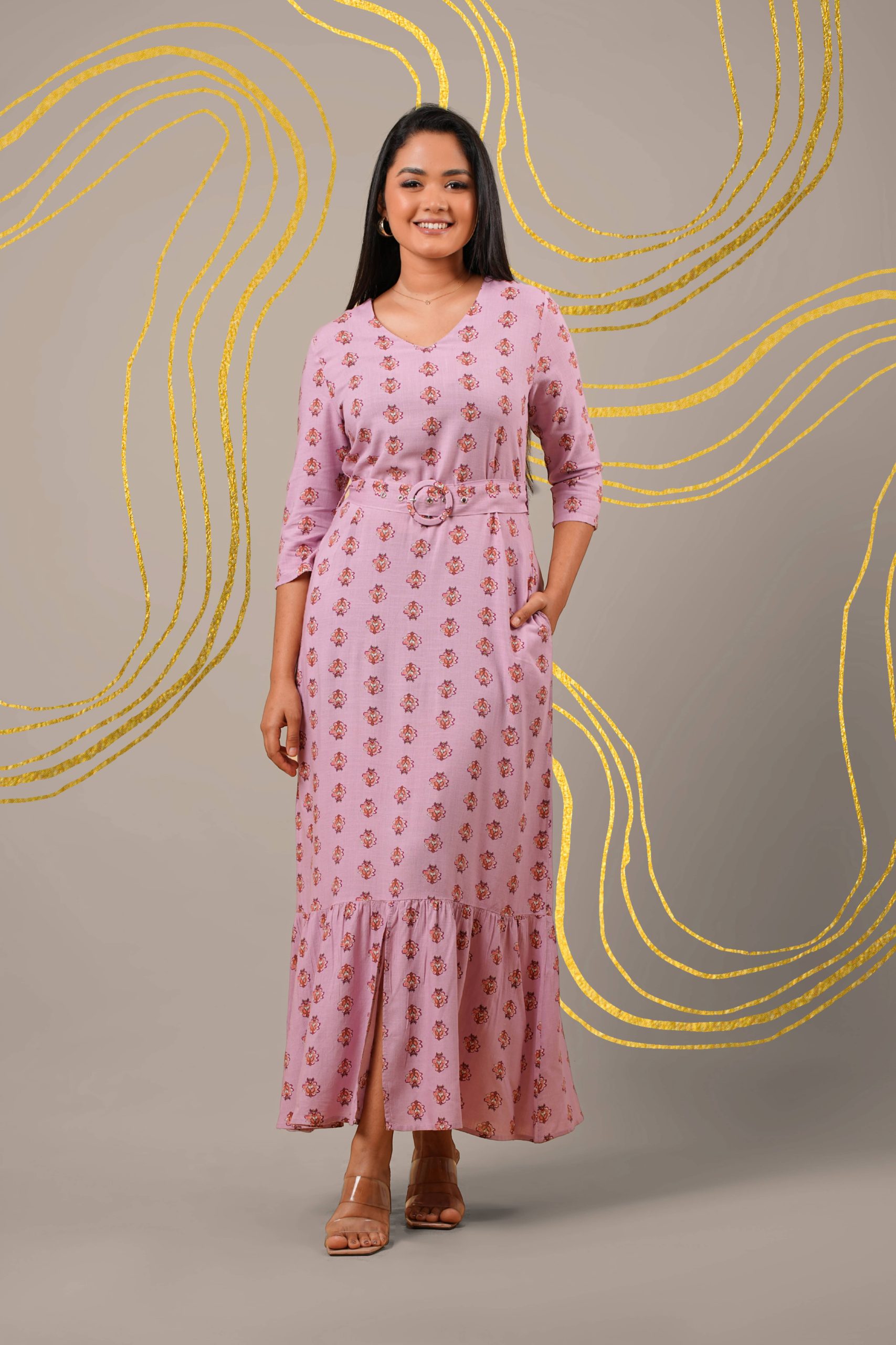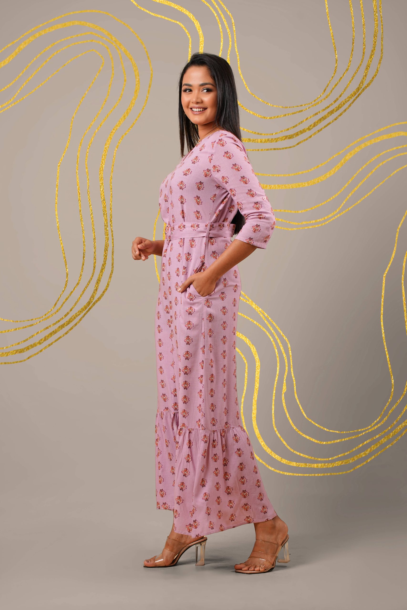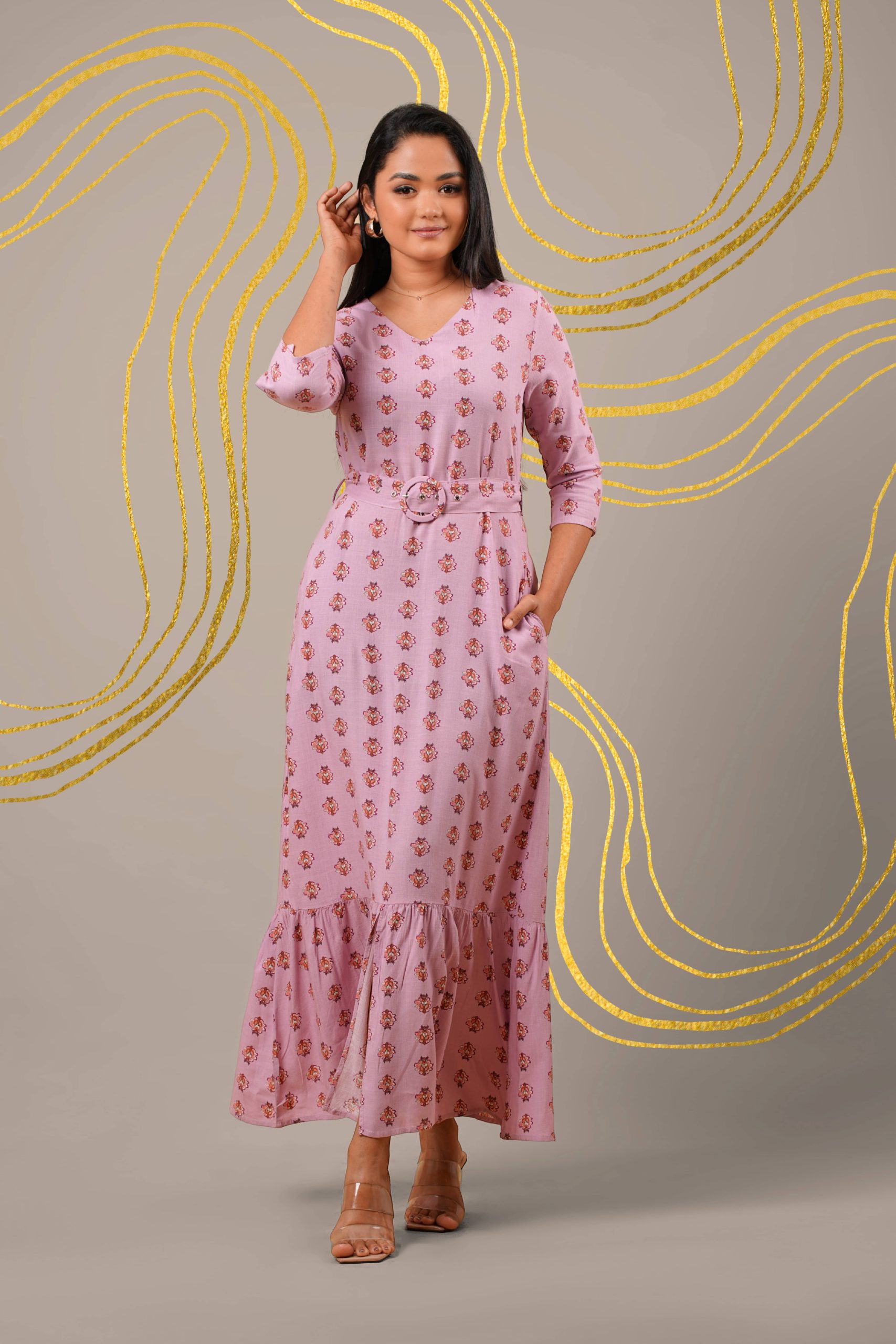 Floral Patterned Frilled Detail Belted Maxi Dress
