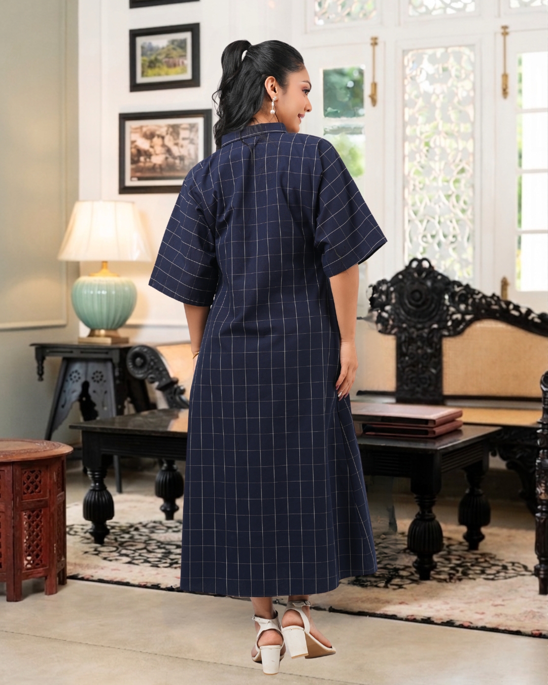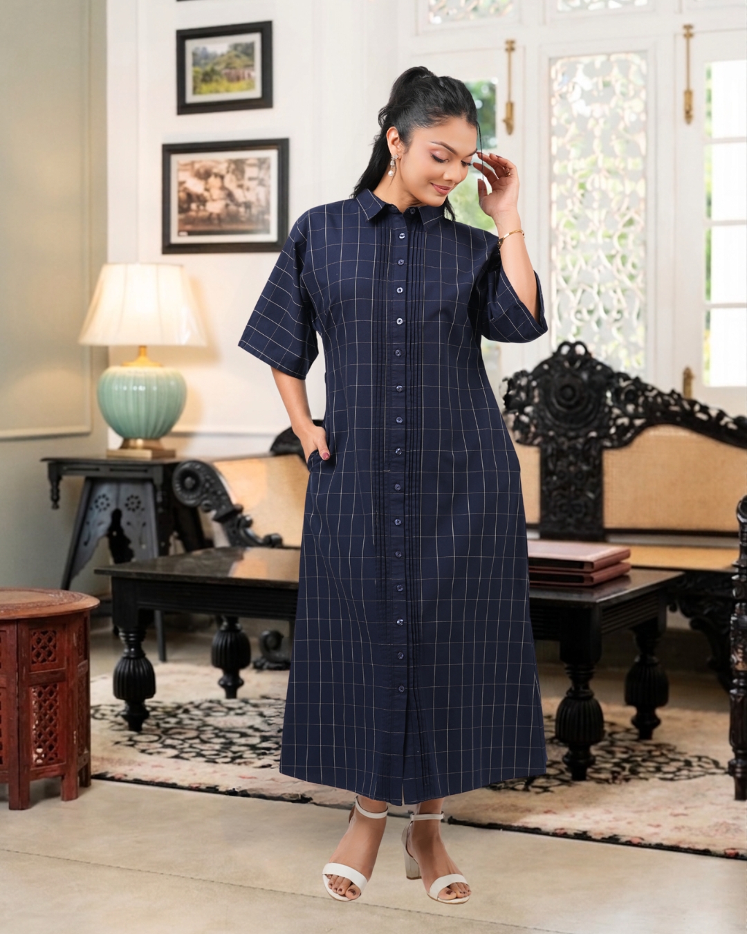 Pintuck Detail Grid Check Midi Shirt Dress
