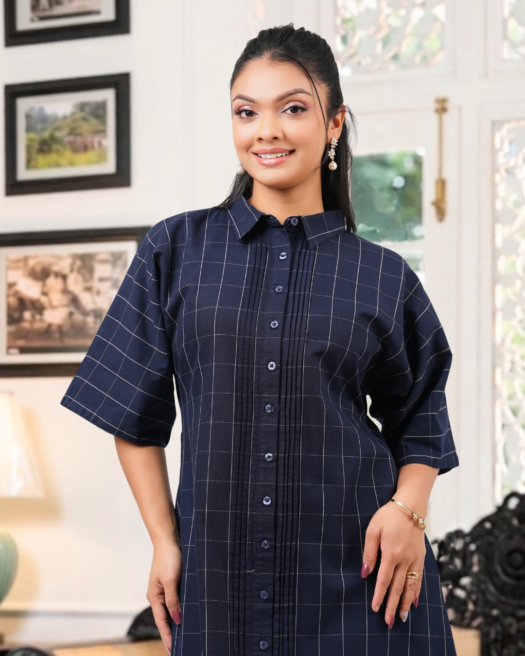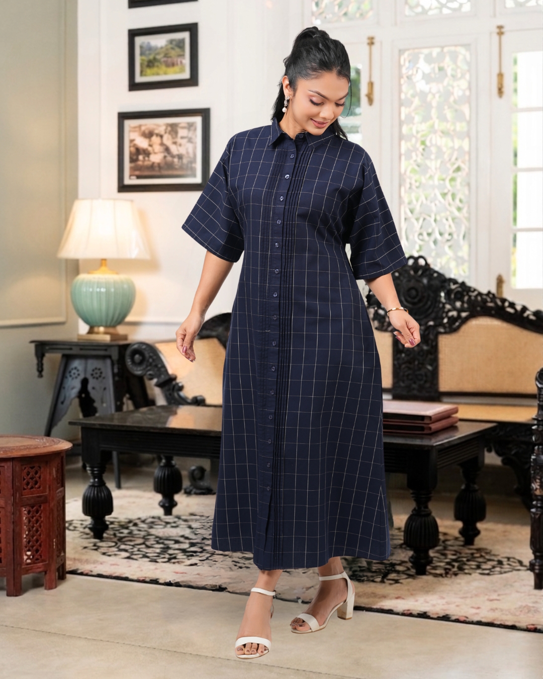 Pintuck Detail Grid Check Midi Shirt Dress